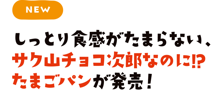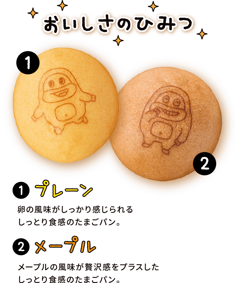 チョコジローのかわいいイラストがプリントされているよ そのままはもちろん、冷やしても、温めてもおいしい! ●冷やす場合 袋のまま冷蔵庫や冷凍庫で保管し、冷たいままお召し上がりください。 ●温める場合 袋からたまごパンを1個取り出して、電子レンジ(600W)の場合:10秒 ※袋から取り出して加熱してください。品質保持剤は電子レンジで加熱しないでください。 ※加熱後はやけどに注意してお取り扱いください。 ※加熱時間は機種や加熱状況に合わせて調整してください。 プリントの種類は全部で16種類
